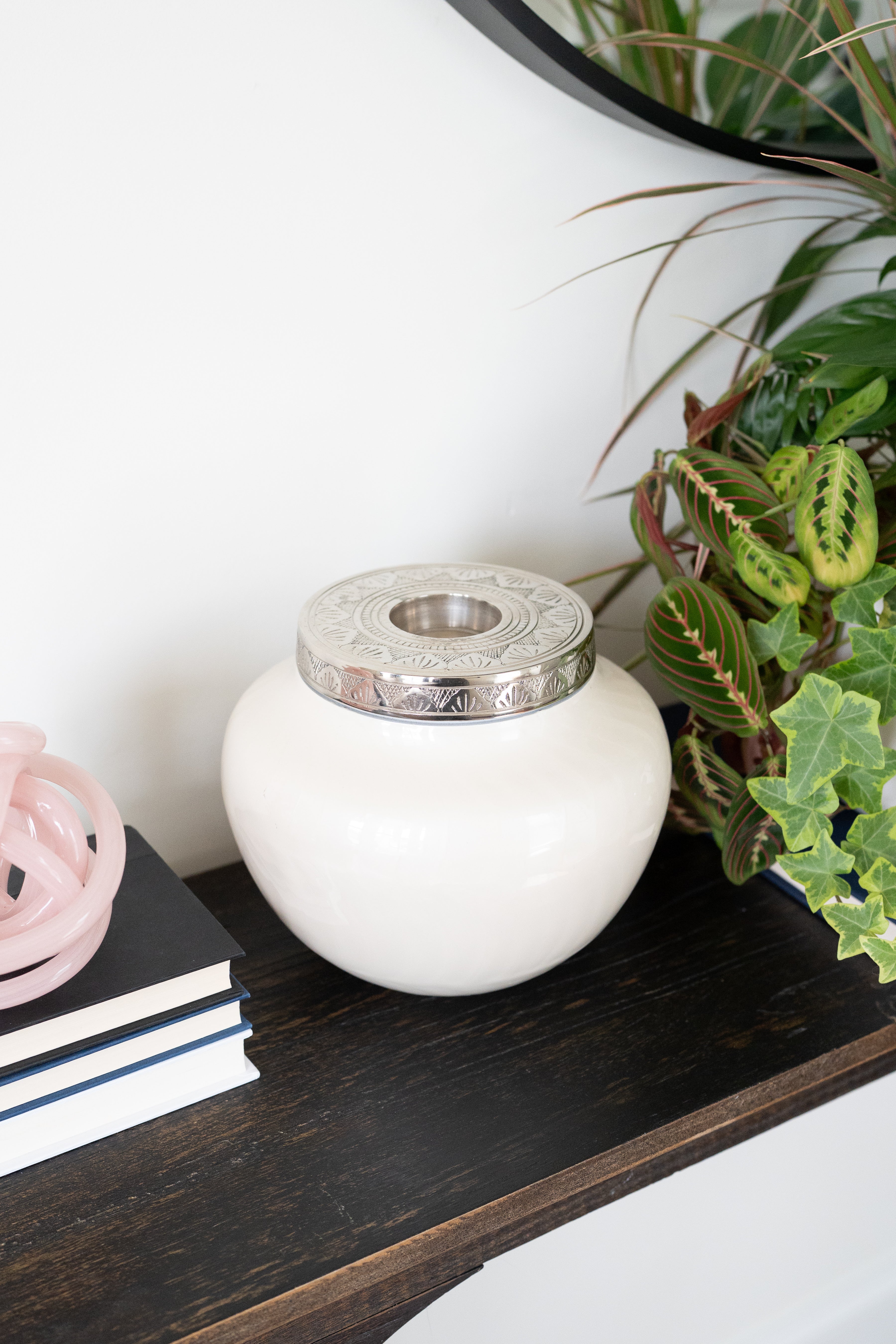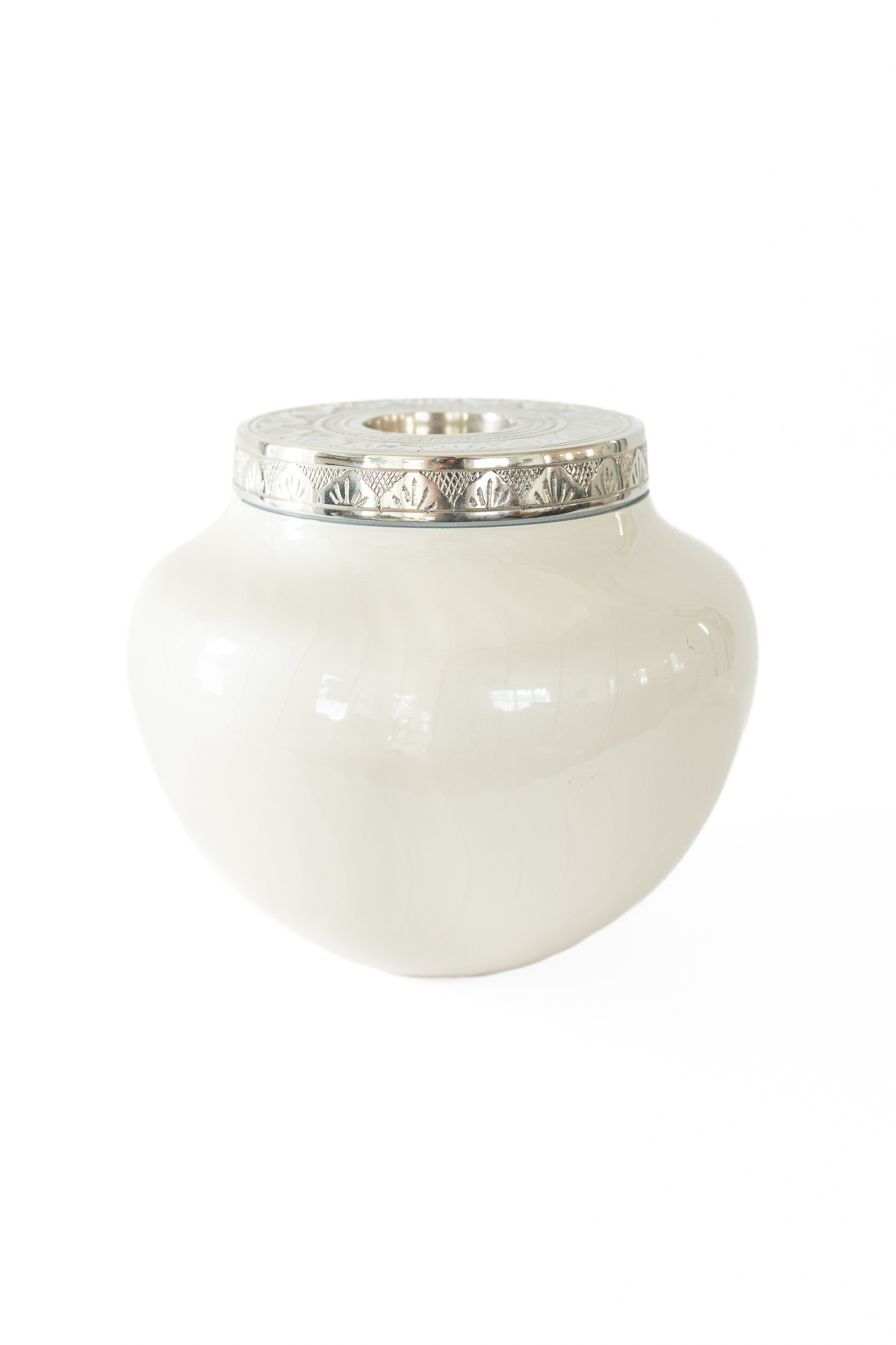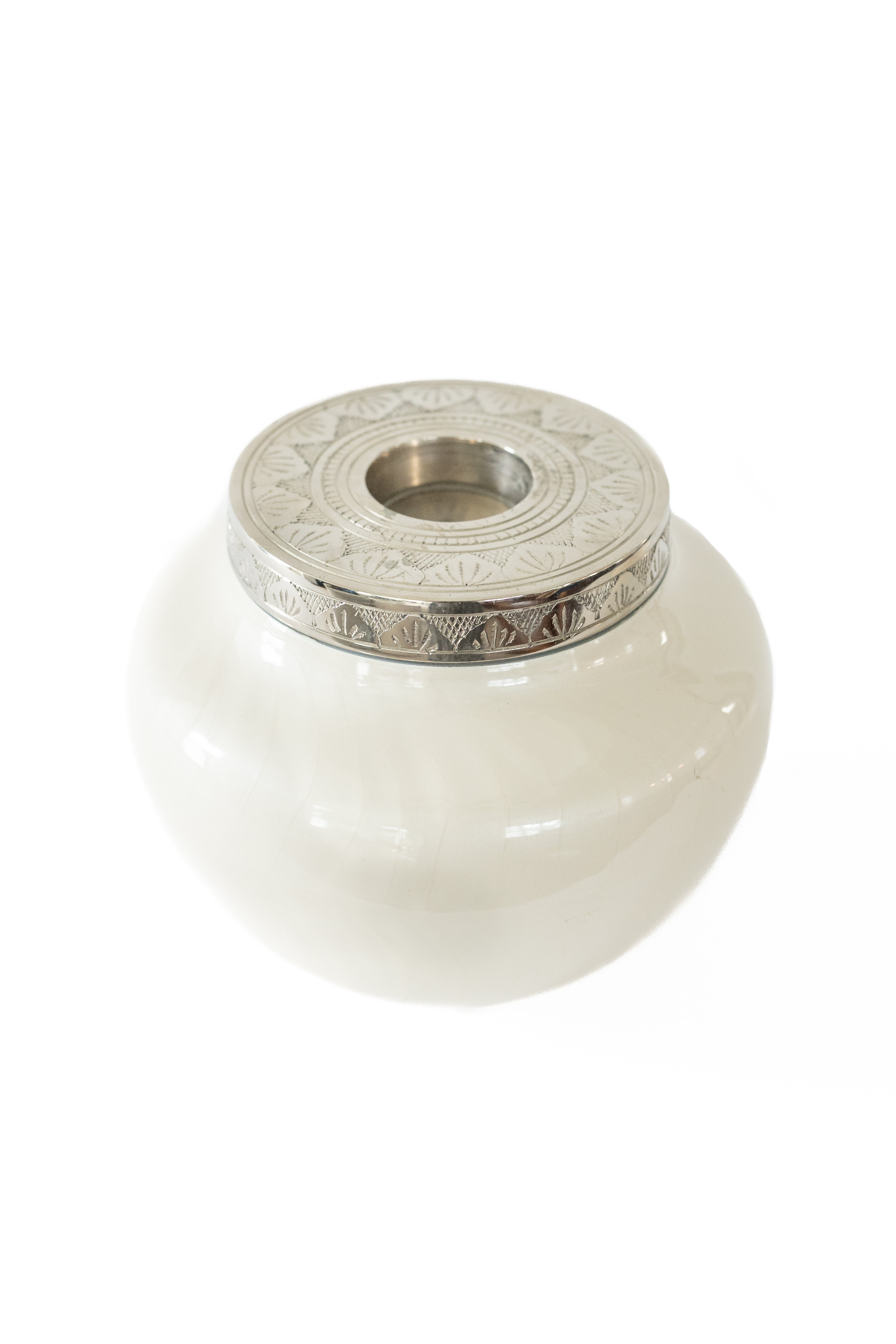 The Partner Memorial Candle Urn Set offers a serene and meaningful solution for funeral homes seeking elegant cremation urns with a symbolic touch. Crafted from high-quality alloy with a polished white finish and a silver top, each urn features a built-in holder in the silver top designed to hold a tealight candle, allowing families to light a flame in memory of their loved ones. Sold in wholesale sets of four, this collection provides exceptional value for memorial service providers.