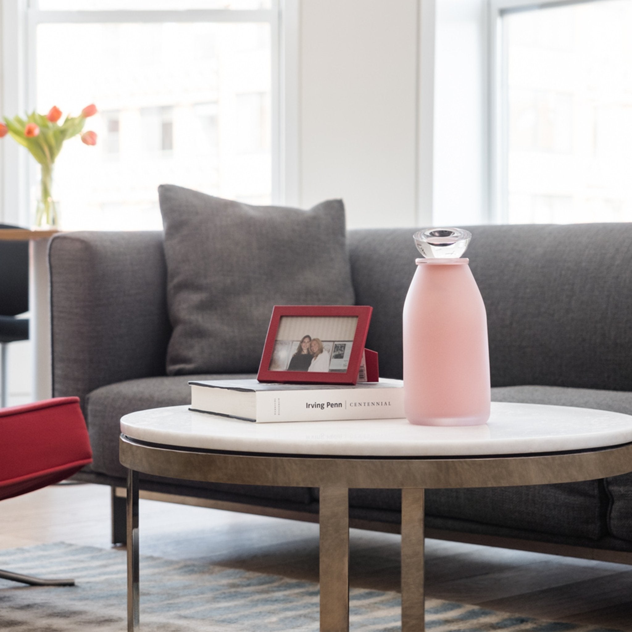 Modern Memorials is proud to exclusively offer this handmade pink glass urn, exuding a cheerful and modern vibe. It’s organic slightly linear base is topped with a clear, transparent lid and a black accent.