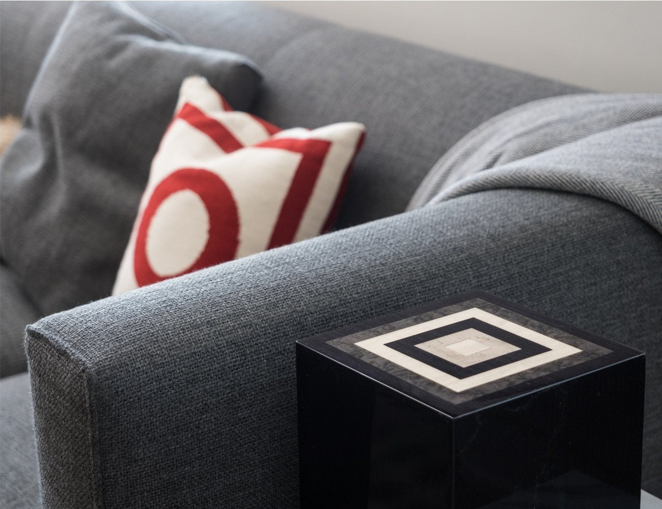The “Piazza” urn is a cube made from mahogany wood with a high gloss dark finish and meticulously placed neutral gray, black, and cream square inlays on top.