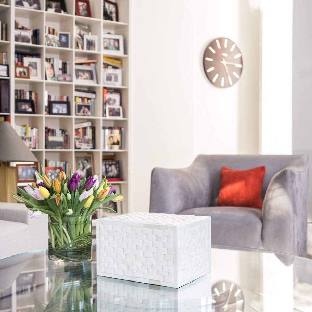 Modern Memorials is proud to exclusively offer this white bone inlay cremation urn. We designed this urn in collaboration with a renowned Indian artist whose accent pieces are sold in upscale home stores across the country. This urn features white basket weave bone inlays hand-placed by experienced artisans over a solid wooden frame.